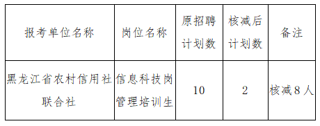 根据《黑龙江省农村信用社员工招聘公告》的相关规定,经研究,现将报名后达不到规定开考比例的部分岗位的招聘计划数核减情况公告如下: