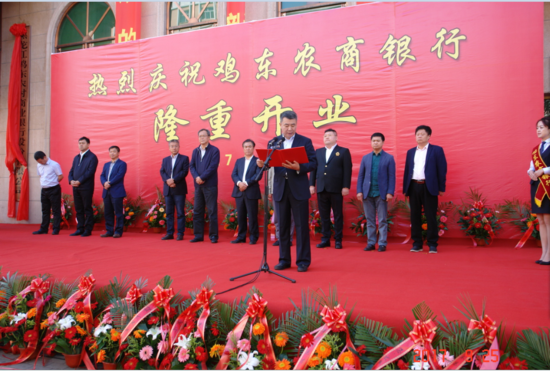 开业仪式上,鸡西银监分局副局长王永君同志宣读了《中国银监会黑龙江监管局关于黑龙江鸡东农村商业银行股份有限公司开业的批复》,并向鸡东农商银行董事长郭俊强同志颁发《金融许可证》;鸡东农商银行董事长郭俊强同志向来宾致欢迎辞;鸡西农商银行董事长杨金波、鸡东县县长王景章分别为开业仪式致辞。最后,鸡西市委常委副市长刘文同志和鸡西市委常委鸡东县委书记王兆成同志为鸡东农商银行揭牌。