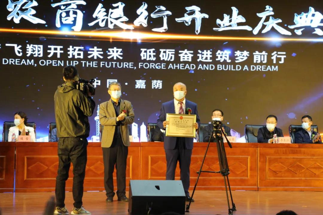 现场嘉荫县委常委、常务副县长王俊峰宣读了《伊春银保监分局关于黑龙江嘉荫农村商业银行股份有限公司开业的批复》,中国银保监会伊春监管分局副局长卢海波向嘉荫农商银行颁发了《金融许可证》。