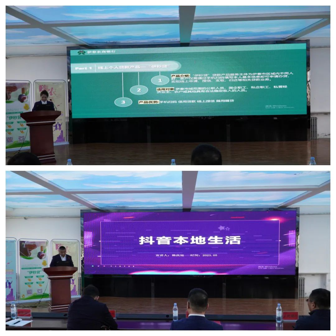 伊春农商银行业务人员讲解“伊秒贷”系列产品和电商贷、抖音生活、金融商城、社区团购等创新业务;企业向全场人员详细介绍特色产品。